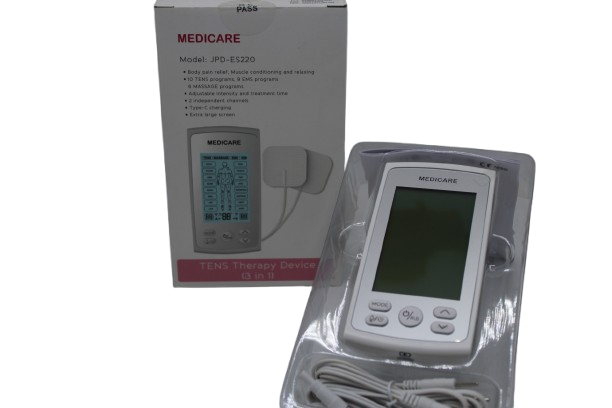 The MediCare TENS Therapy Device JPD-ES220 is a modern Transcutaneous Electrical Nerve Stimulation (TENS) unit designed for safe and effective pain relief therapy. Using gentle electrical impulses, it stimulates nerves and muscles, reducing pain signals and improving blood circulation.
